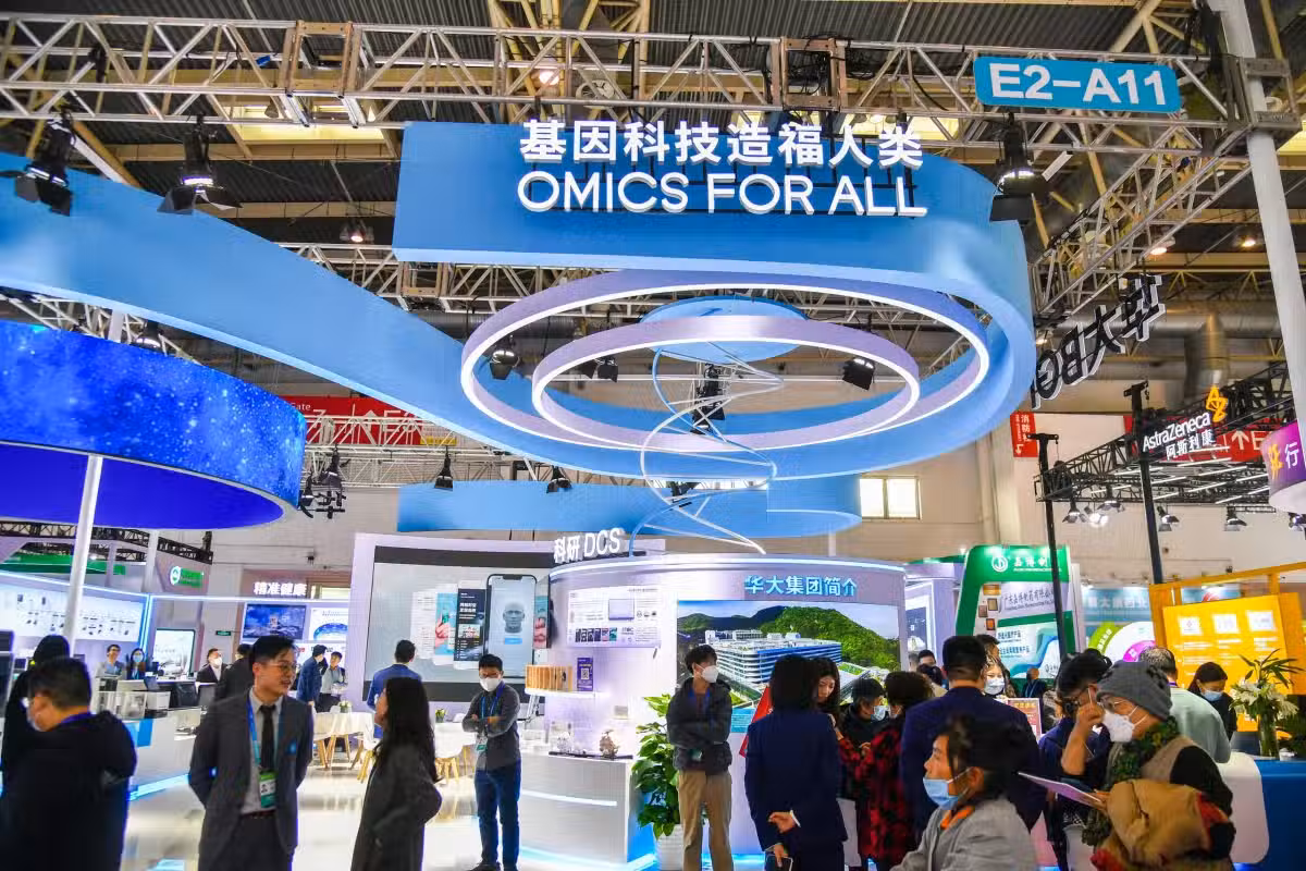 首屆鏈博會上,觀眾在華大集團展台參觀 /IC Photo