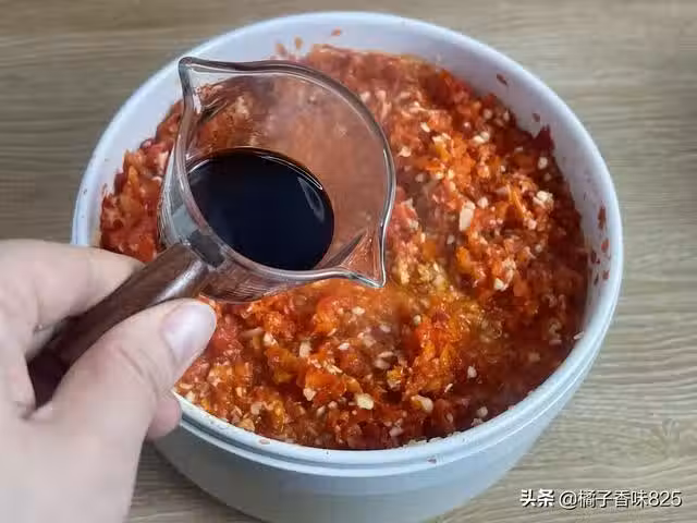 7、出鍋前,再加入一勺白酒,炒勻後就可以了,晾涼後裝在瓶子中,密封后冰箱冷藏保存,最少能吃一個星期。第一白酒可以殺菌,第二白酒可以延長保質期,第三白酒可以讓辣椒醬口感更好。