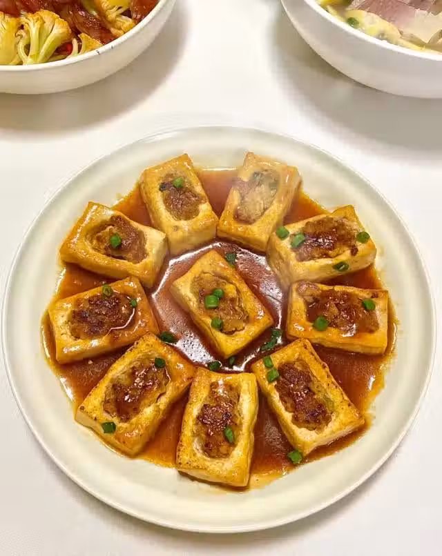2老豆腐切塊,中間挖小口,放入肉末,熱油煎至兩面金黃