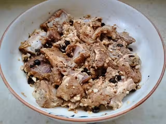 6、將腌好的排骨塊擺放在土豆塊上,儘量擺放均勻薄點,這樣更容易熟,鍋里放水燒開,我們把盤子放入蒸鍋。