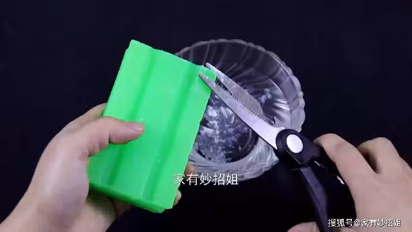 然後再準備半碗熱水,接著用剪刀在肥皂上剪下來一些碎屑到碗里,肥皂的碎屑也不需要太多了。
