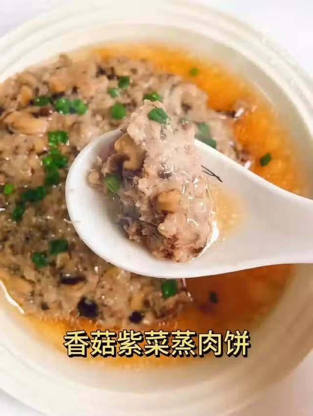 做法:豬肉剁餡+香菇切碎,加上一點紫菜,加半勺醬油,加1勺玉米澱粉和少量鹽,食材拌勻後放入盤中,冷水上鍋蒸15分鐘,起鍋後撒點蔥花。