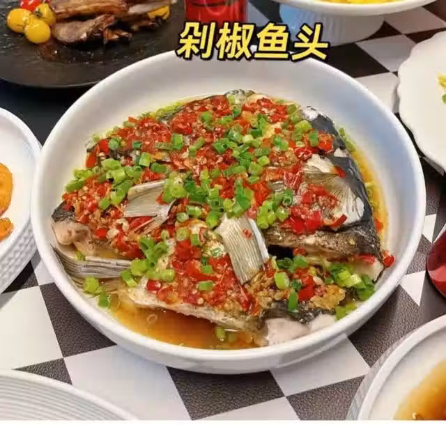 第二步,調好的剁椒料鋪在魚頭上,蒸20分鐘。