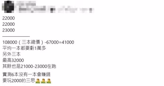 後續他也補充,剩下三本也通通虧錢,最高金額僅3萬2000元,其餘也是約莫2萬1000元到2萬3000元不等,實測六本沒有一本賺錢,讓他忍不住奉勸廣大民眾,「要玩2000的要三思」。