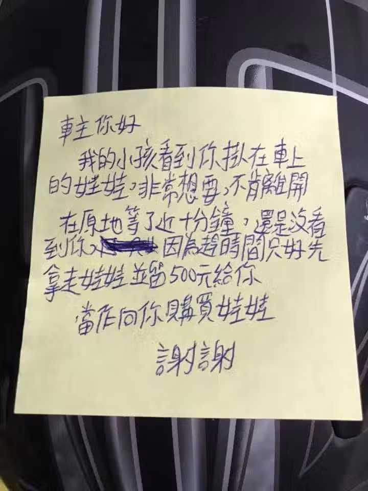 重機後座掛娃娃「家長留紙條拿走」:小孩想要!他急找人「說有留錢也沒看到」最後發展掀熱議