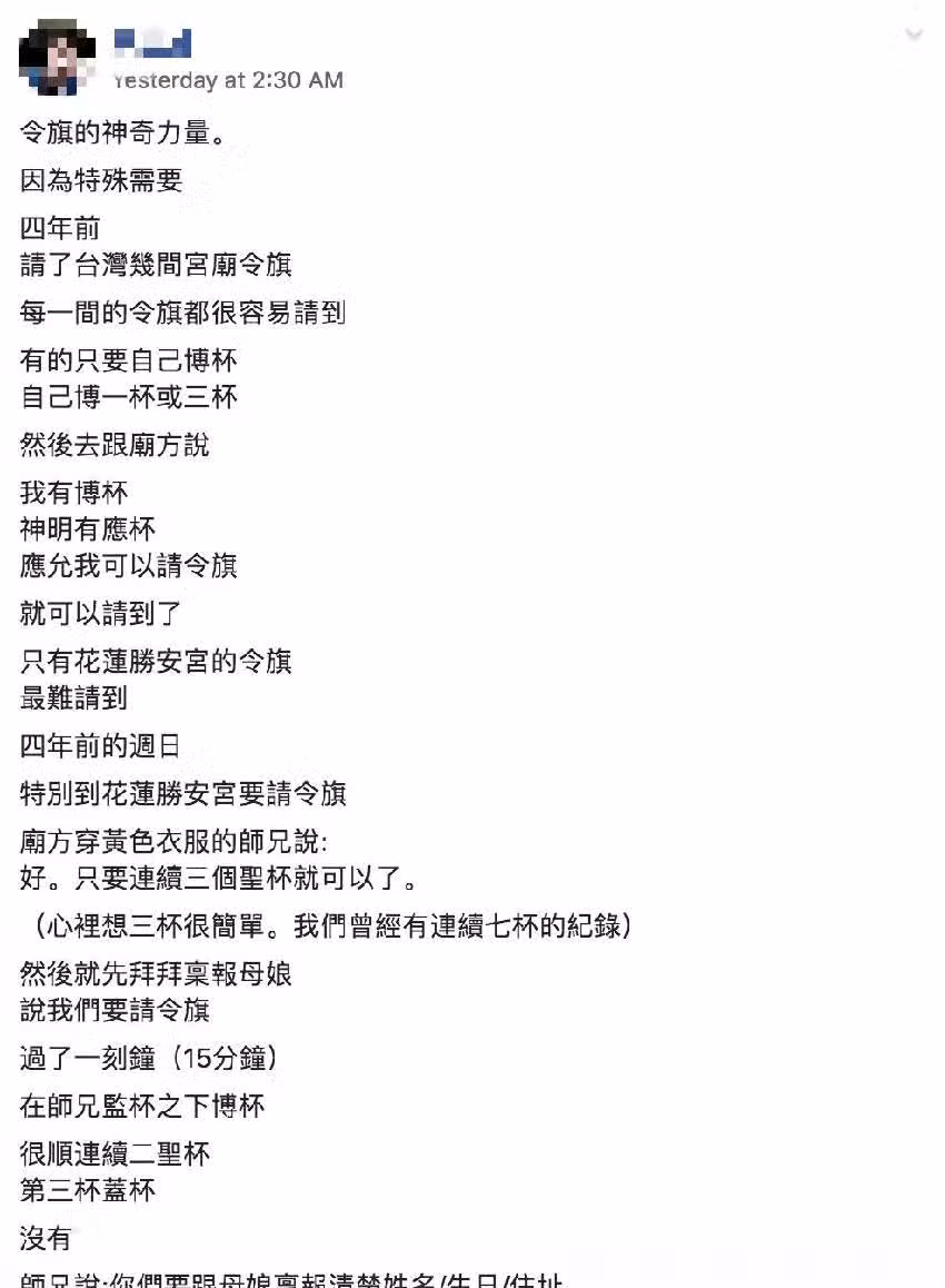」另外他也表示,一開始要請令旗的時候,原本旁邊還有2位年輕男生在擲筊想請令旗,但他們求了整整兩天都沒有得到首肯,最後只能摸摸鼻子回家去,而如今發生了這一系列事情後,原PO覺得很感謝,「我們一家真的受到眷顧了。