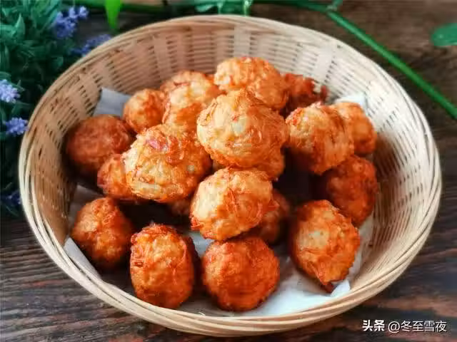 【素炸蘿蔔丸子】所需材料:紅蘿蔔半個、米飯1碗、麵粉半碗、雞蛋1個、油鹽適量、姜2片、十三香1茶匙、白鬍椒粉1茶匙、雞精1茶匙、