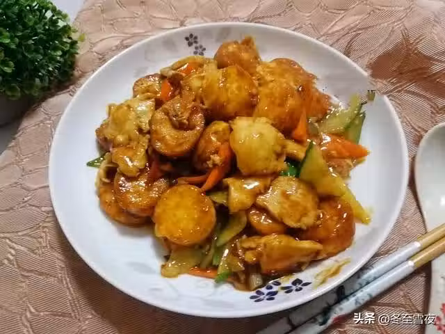 【雞片燒日本豆腐】所需材料:日本豆腐4個、黃瓜1/2根、胡蘿蔔1/2根、雞胸脯肉100克、油鹽適量、蔥1段、姜2片、大蒜2瓣、料酒1湯匙、醬油1湯匙、澱粉適量