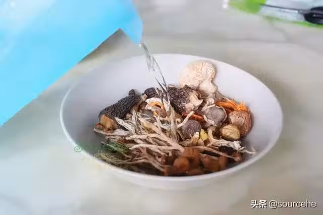 步驟3:浸泡的猴頭菇,要用手重複擠壓水,融化沖洗,這樣的可以去猴頭菇的苦味。所以食材泡軟之後,沖洗乾淨擠壓水。