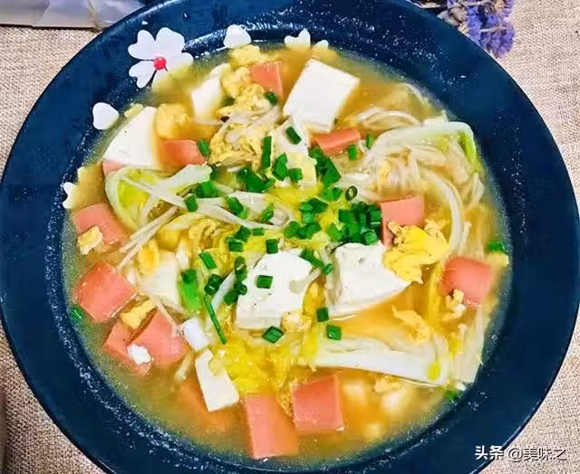 娃娃菜1顆、水豆腐1塊、金針菇少量、火腿腸1根、雞蛋2個、油適量、鹽適量、蝦粉1勺、雞粉1勺。