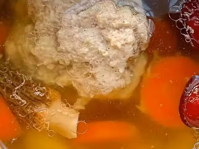 2、豬肉清洗乾淨切成小塊,剁成肉末後團成丸子放入蒸碗中,再放入山藥、胡蘿蔔、板栗和紅棗,加入適量清水,蓋上蓋子隔水燉煮兩個小時。