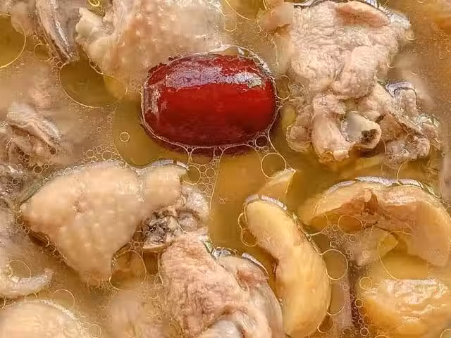 2、將雞肉、板栗、紅棗和薑片放入鍋中,加入適量的清水,大火煮開後轉小火煮四十分鐘。
