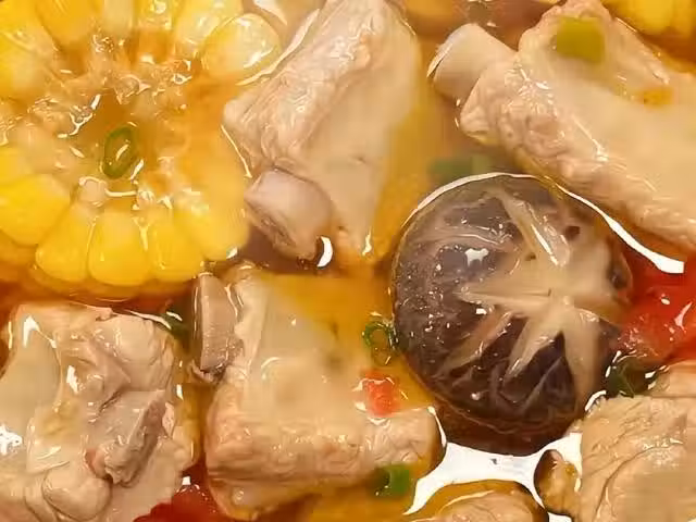 3、起鍋燒油,油熱後放入番茄,炒出汁水後放入排骨翻炒片刻。再放入玉米、香菇和適量清水,攪拌均勻後蓋上蓋子燜煮一個小時。