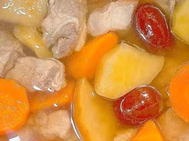 3、將排骨、胡蘿蔔、紅棗和薑片放入湯鍋中,加入適量清水,先開大火煮開,再轉小火煮二十分鐘。