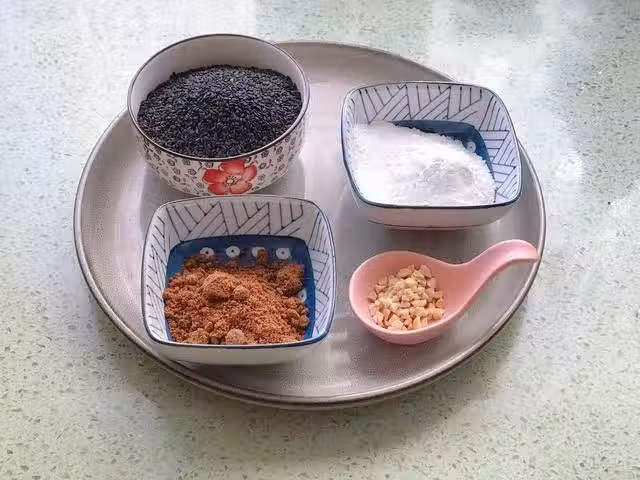 第一步:將黑芝麻倒進細篩網中,用清水洗乾淨,瀝干水分後倒入無油的鍋中翻炒,炒到乾燥並且芝麻香味飄出來,倒出來晾涼備用。
