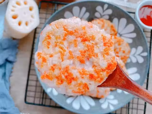 【原材料】蝦仁200g、蓮藕130g、胡蘿蔔70g、蛋清一個、澱粉適量、食鹽、胡椒粉;
