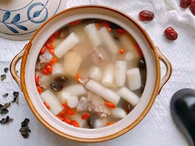 4、時間到,排骨燉煮好之後,取出來倒在小砂鍋中,山藥和木耳比較容易燉熟,等排骨燉好之後可以放在砂鍋中燉煮;所有食材都倒在砂鍋中,大火煮開之後轉小火,撇去表面的浮沫,蓋上蓋子,小火燉煮15-20分鐘;
