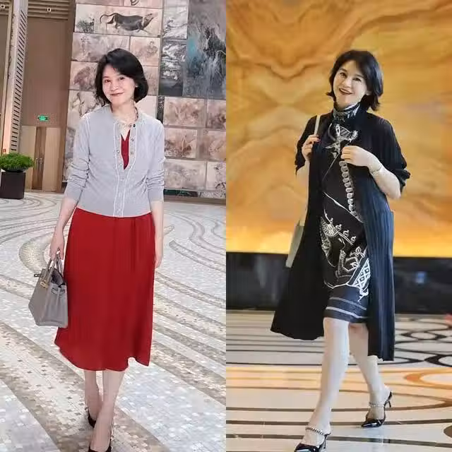 針織外套是最符合中年女人成熟氣度的上衣服飾,針織的面料材質細膩且柔軟,並且任何身材的中年女人都可以靈活穿搭。左圖穿的這款淺灰色針織外套搭配紅色「大波浪裙」的穿搭組合優雅華麗,下半身露出的大波浪裙擺浪漫洋氣,充分削弱了中年女人穿搭的年齡感,氣質出眾。