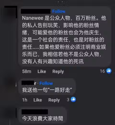 「Namewee是公眾人物,百萬粉絲… … 這是一個社會的責任,也是對粉絲的責任… … 如果他愛粉絲必須註明商業娛樂而已,我相信若他不是公眾人物,沒有人有興趣知道他的死訊。」