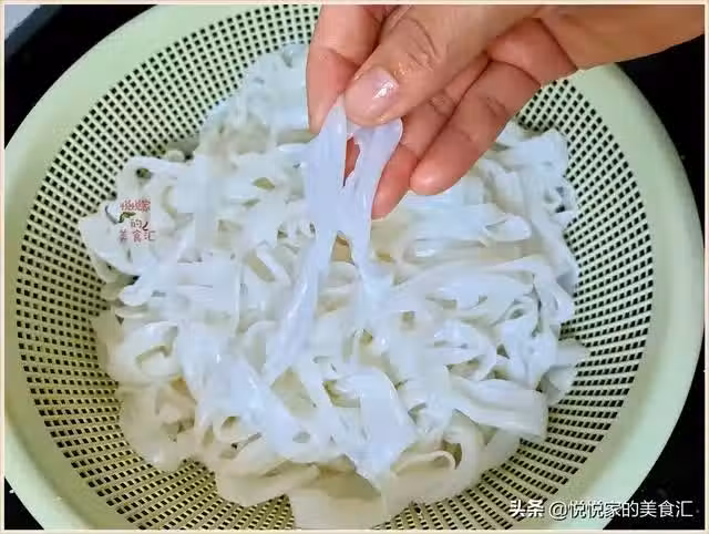【第一步】:新鮮的河粉柔軟滑嫩,價格只要3元一斤,人少的話只要買2元就足夠了,我們家裡小孩子極愛吃河粉,所以每次都是買5元,買回來之後只要簡單的把它理一理,分一分,把粘在一起的一根一根的分開來,這樣就在避免在炒的時候粘成坨了,