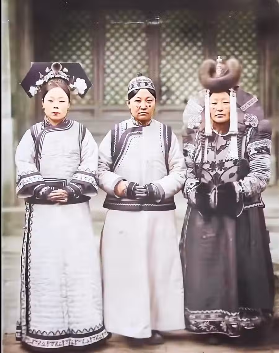 三位滿蒙貴婦的合影照,左邊是滿族女子,頭戴大拉翅,另一位戴著瓜皮帽,右邊是蒙古女子,戴著牛角頭飾,容貌一般卻有一股獨特的韻味。滿蒙女子可以成為大清皇帝的妃嬪,不知道這般顏值皇帝中意不?