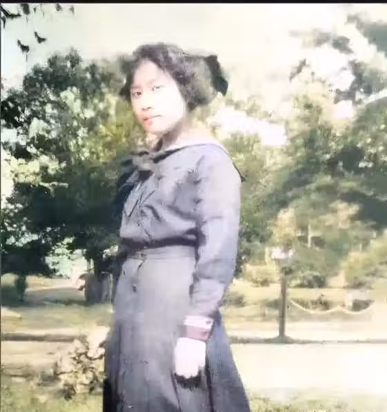 1910年,宋美齡在美國威爾斯利女子學院讀書時的罕見照片。這時的宋美齡剛到美國讀書不久,她身穿長裙,盤著頭髮,別看年紀不大,眼神卻很犀利。