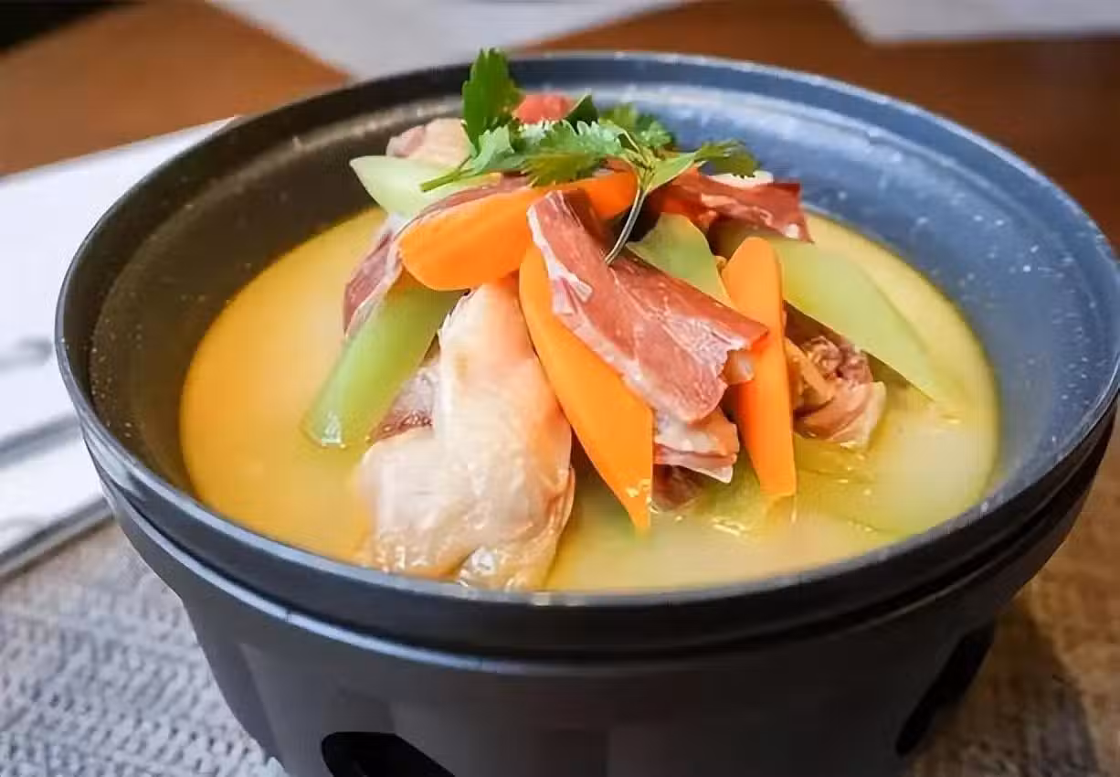 2、熱鍋下菜籽油,加入蔥、姜,煸香後加入高湯燒開,再加青筍、風雞、火腿片、胡蘿蔔片,大火煮10分鐘後加入鹽、糖調味即可。