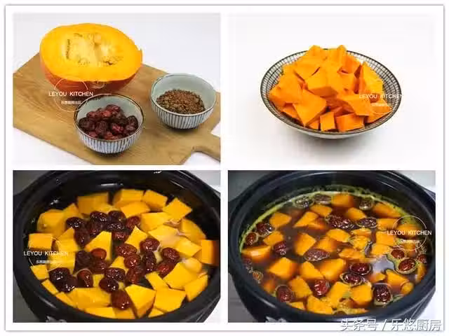 第三步:把南瓜、紅棗放入砂鍋中,再倒入1500毫升清水燒開後轉小火煮15分鐘。
