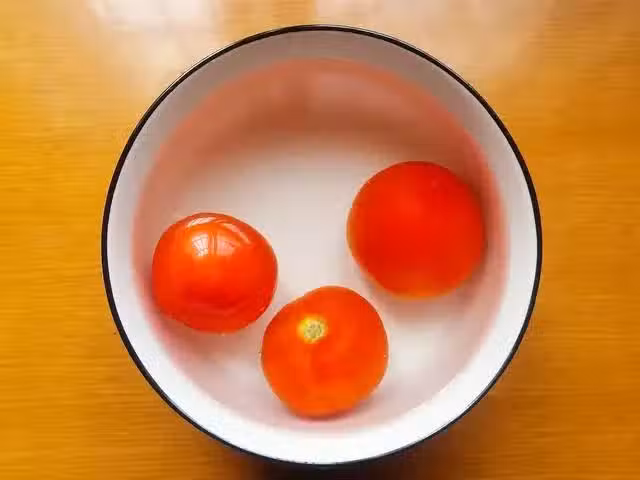 2、1分鐘後撈出燙過的西紅柿,用涼水沖一下降溫,再把它的外皮給撕掉,用熱水燙過的西紅柿,表皮非常容易去除,等皮都撕完後用刀切成碎丁狀待用