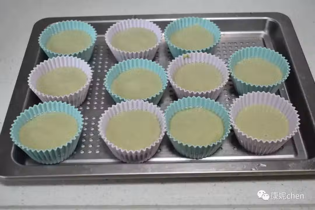 第六步 把艾葉發糕麵糊倒入小蛋糕模具中,不要倒太慢,以免發酵和蒸發糕時溢出蛋糕模。