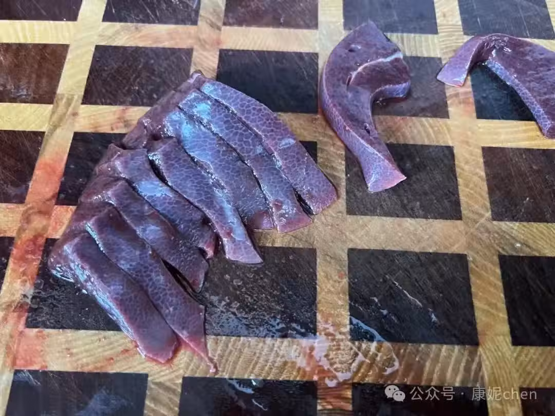 第三步:豬肝切厚片,豬肝不要切得太薄,切厚點吃起來有口感,且不會那麼容易煮老。
