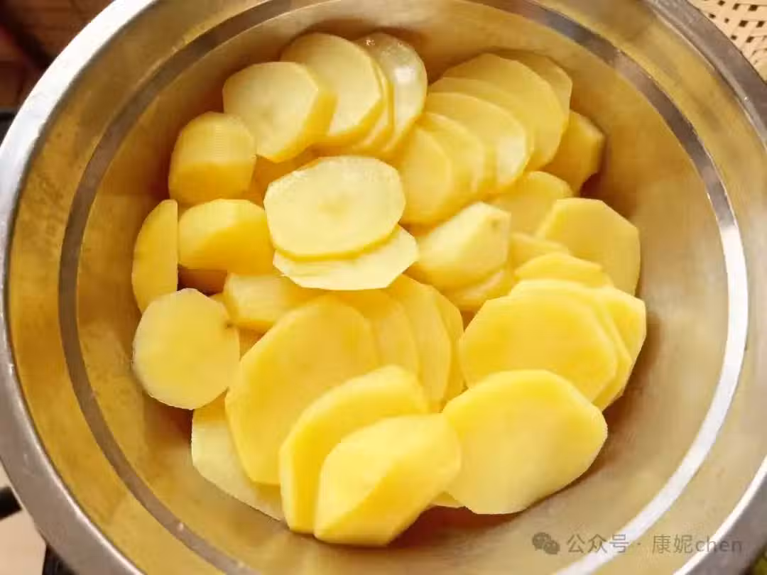第二步土豆削皮切成薄片,用蒸鍋或者蒸箱將土豆蒸熟。