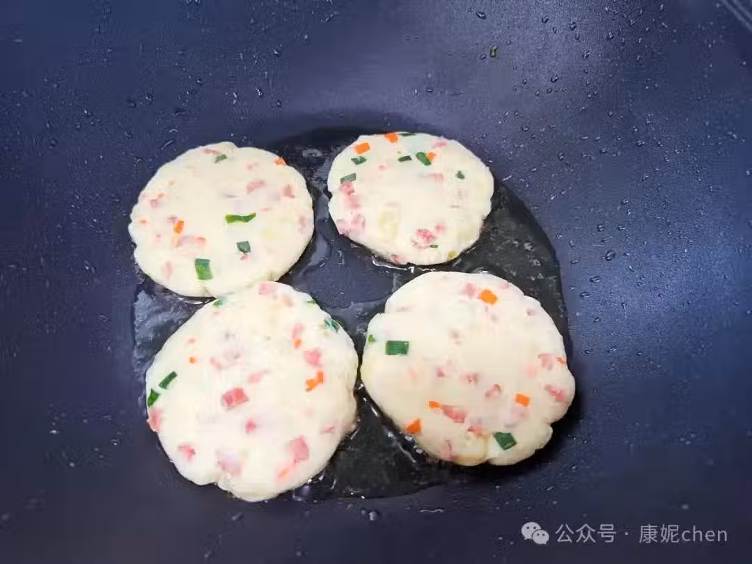 第七步:炒鍋加入花生油,將土豆餅放入鍋中,用中火煎土豆餅。