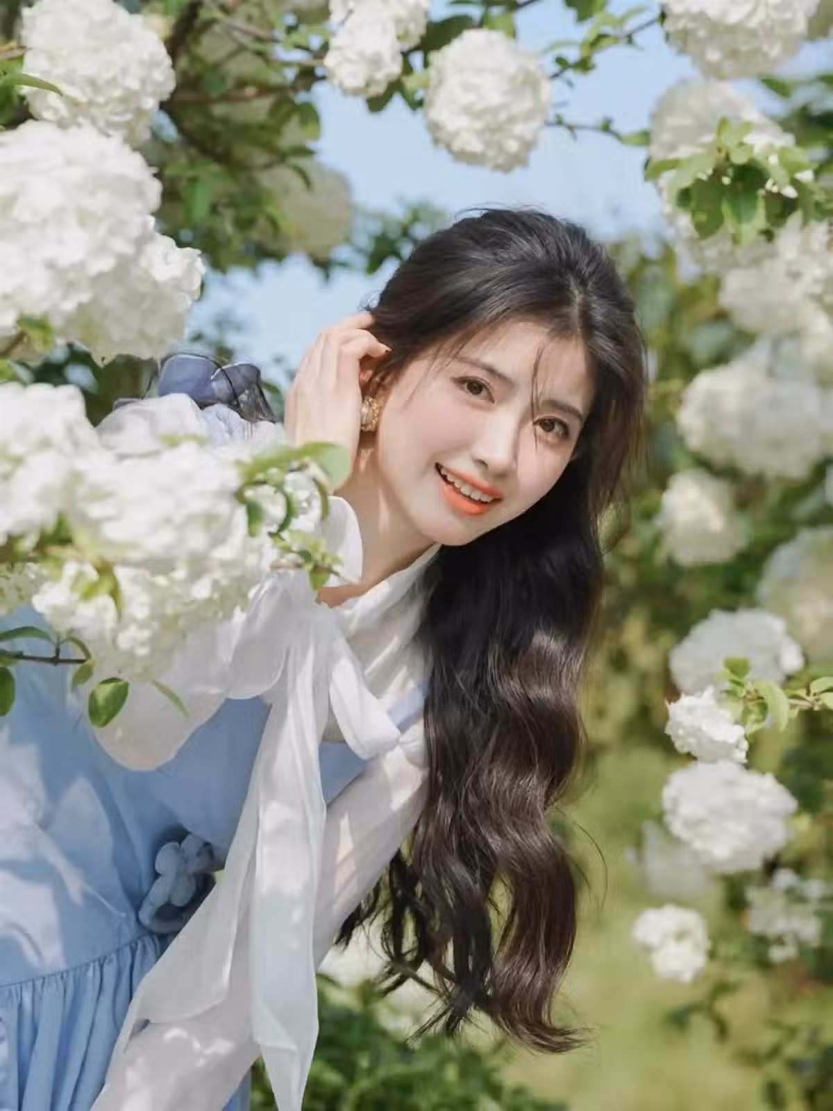 繡球花人像攝影,學會利用近處的花朵或枝葉作為前景,以此增加空間深度和層次感,利用前景構圖時,還可以配合上低角度的拍攝,讓模特「置身」花海之中,拍出被花海包圍的既視感。