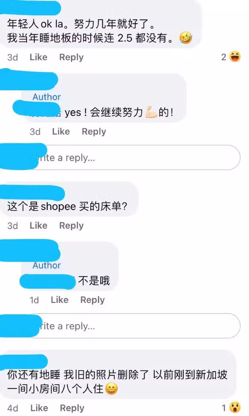 有網民也分享道,「你還有地睡,我舊的照片刪除了,以前剛到新加坡,一間小房間八個人住」、「我剛開始來新加坡的時候也是這樣,床還比你薄,沖涼沒熱水,還是用水桶裝的,常常沖一半要站著等水再盛好,