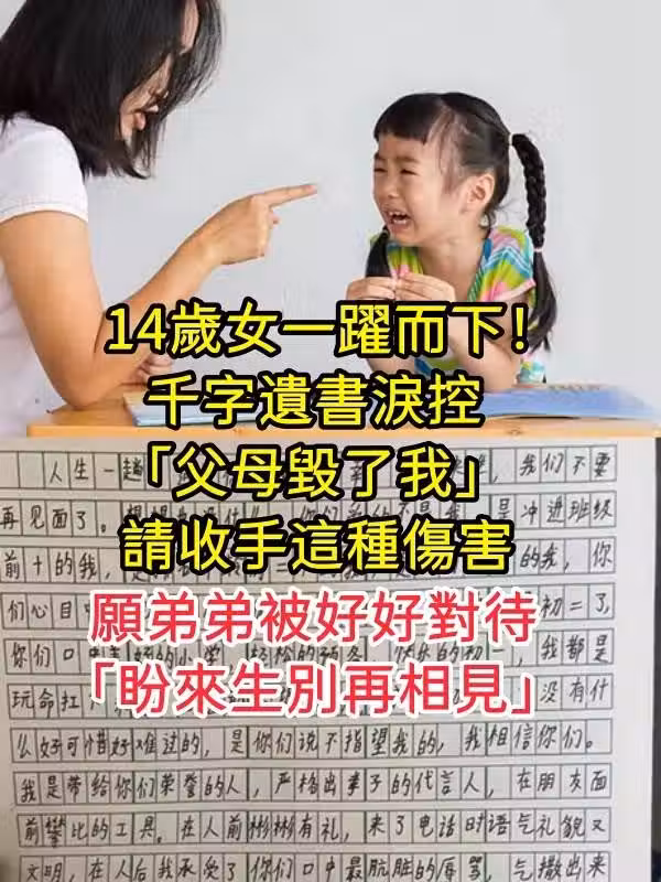 14歲女一躍而下!千字遺書淚控「父母毀了我」:請收手這種傷害 願弟弟被好好對待「盼來生別再相見~」