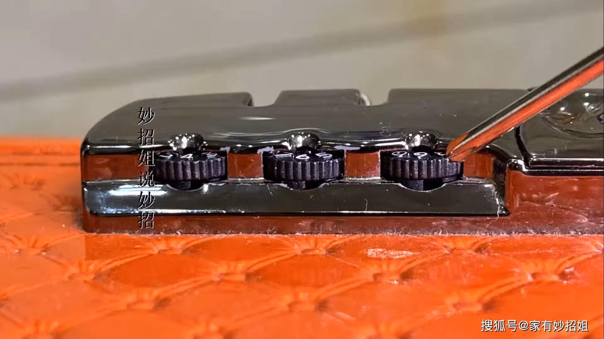 現在,我們已經將三個轉盤的凹槽都調整到了同一個方向,此時顯示的數字是469。將三個轉盤往同一個方向撥動一個數字,無論是向左還是向右都可以,但必須保持三個轉盤的方向一致。