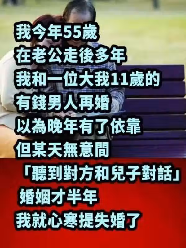 我今年55歲,在老公走後多年,我和一位大我11歲的有錢男人再婚,以為晚年有了依靠,但某天無意間「聽到對方和兒子對話」,婚姻才半年我就心寒提失婚了!!