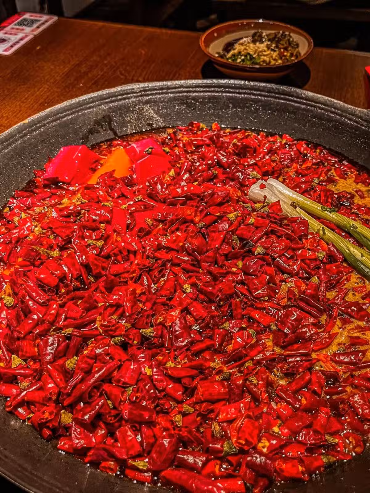當然一定要來介紹這家店的招牌菜啦!大家都知道成都愛吃辣又重口味,看到這滿滿漂浮著辣椒的湯底,是不是嚇到了啊!