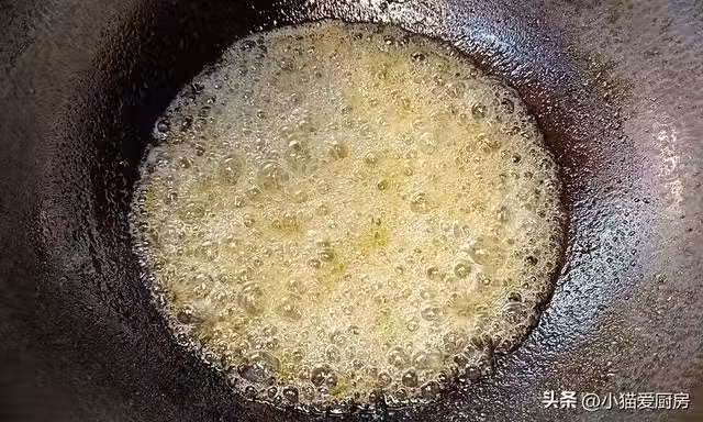 【步驟四】:當糖漿泡泡的顏色開始變成淺黃色,也就是和色拉油的顏色的時候,這個時候可以用來掛霜,像我們常見的江米條、糖花生。