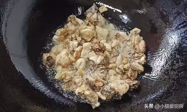 【步驟六】:雞肉水分炒干,繼續翻炒至表面焦黃,放入蔥姜蒜炒出香味,放入白糖1勺、生抽2勺、蚝油1勺、鹽少許,放入半罐啤酒,蓋上蓋用中火燉煮10分鐘左右。