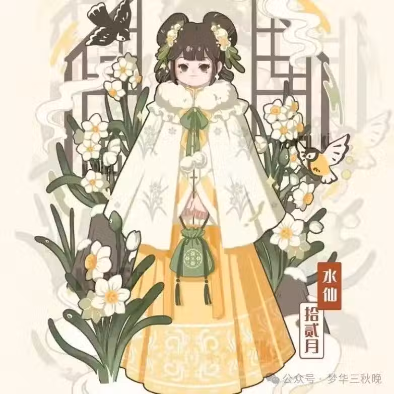 洛神是十二位花神里唯一的一位「神」。洛神出自曹植的《洛神賦》,在這首賦中曹植將洛神比作水仙,洛神的水仙花神之名便由此而來。百美排第六十五。
