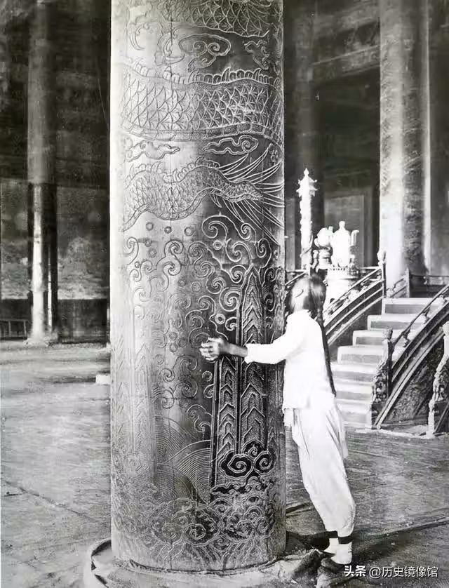 小川一真拍攝這張太和殿內的金漆盤龍柱時,讓這個中國人作為參照物張開雙臂抱住龍柱,以顯示金漆盤龍柱之大。