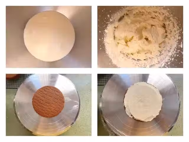 7、奶油抹好後,篩上一層打好的粉末,再放一張餅,繼續重複剛才的操作,這樣一層奶油一層粉,直到全部做完,最後在側面四周抹一層奶油,將四周的的粉末撒在側面的奶油上,用保鮮膜將整個蛋糕包裹起來,放入冰箱回潮最少4個小時,建議放置一晚口感會更好。