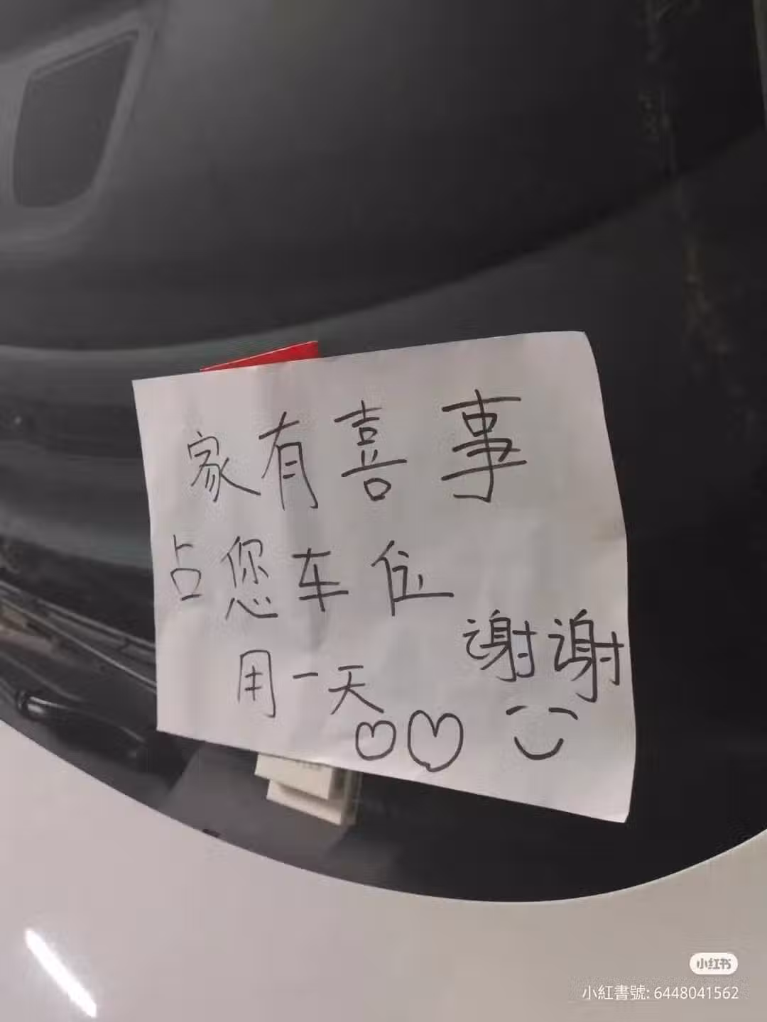 一名中國網友PO文分享,表示正要停車時發現自己的車位居然被人停走了,心中一把火正要上來之際,就看到那輛佔了位子的車上貼了一張大大的白紙,上面則寫著「家有喜事,佔您車位用一天,謝謝」,雖然看似有禮貌,但這種先斬後奏的做法還是讓人不是很開心啊,畢竟說實在的,你家有喜事、干我P事?而且車位被停走了自己要停哪?