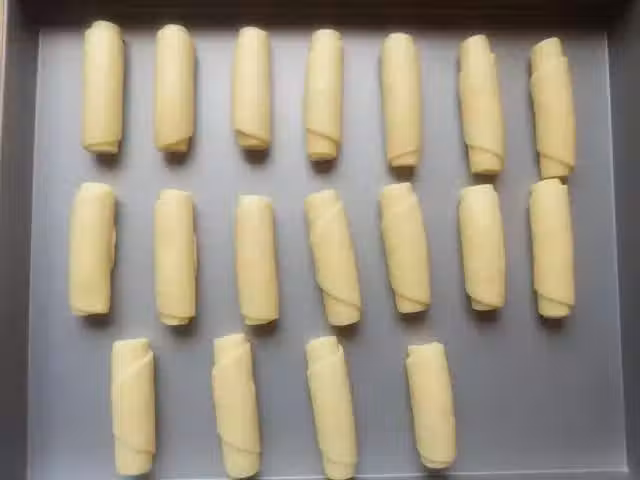 10、5分鐘後,取出一個卷拍扁,用擀麵杖再次擀開,繼續由下而上捲起。