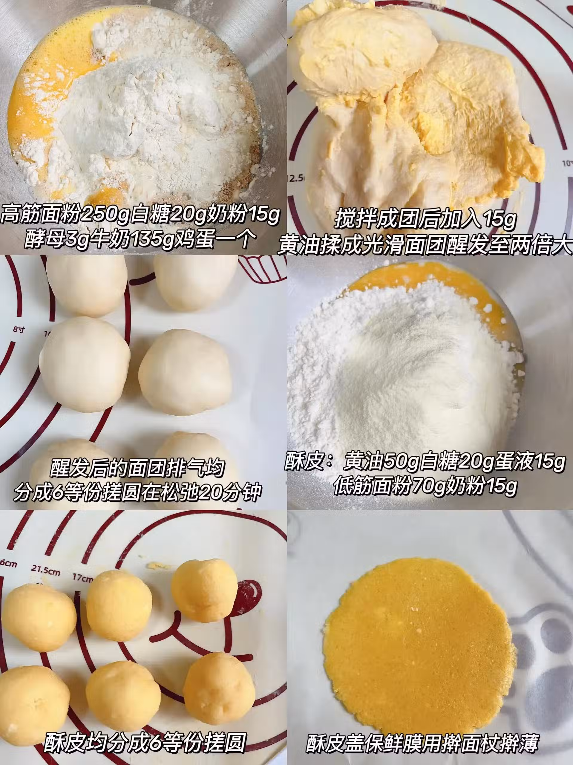 3、這時候,我們開始做酥皮!把所有酥皮食材混在一起,拌勻後也分成6小塊,每塊都揉成圓球。之後用保鮮膜蓋住,壓成薄薄的圓形。