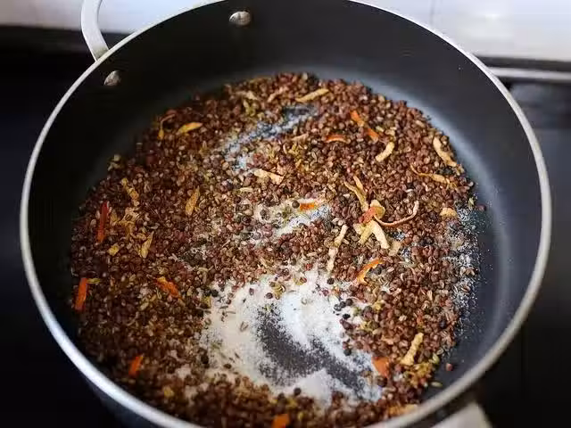 5、將炒好的食材倒入料理機內,稍微晾涼後加入雞精,然後蓋上蓋子,攪打成粉末狀。這裡雞精也可以用味精來替代。