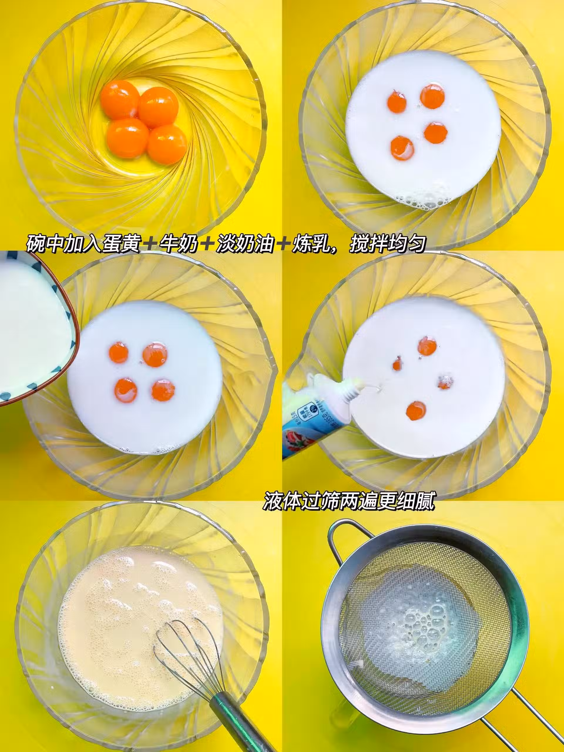 2、為了口感更細膩,記得把液體過篩兩遍哦。然後倒入放好紙托的模具,8分滿就剛剛好。