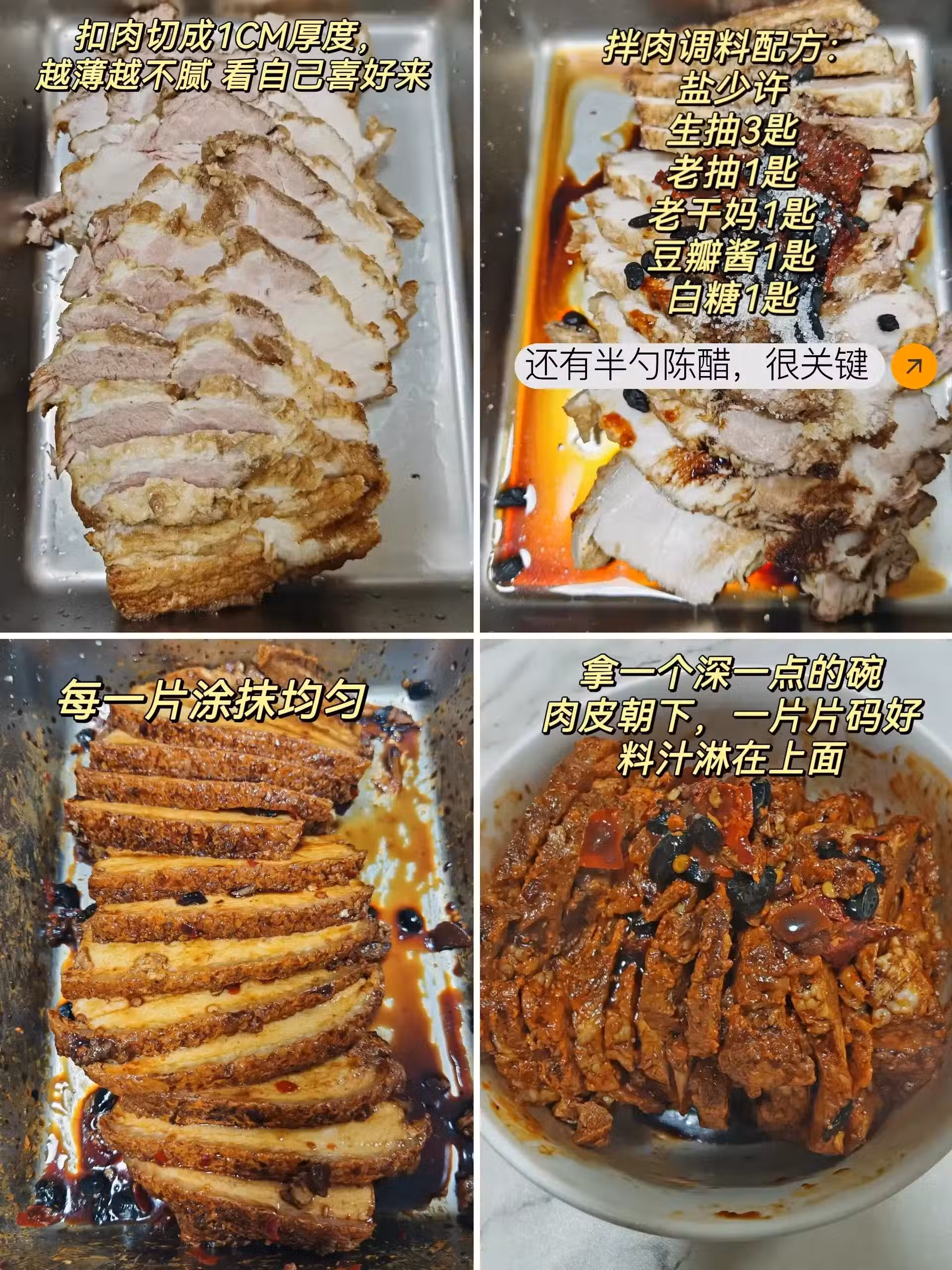 接下來就是定扣肉了,得拿一個深一點的碗,把肉皮朝下一片片碼好;這一步衡陽人管叫「定扣肉」;你別看這步驟簡單,其實這裡頭可有大學問!這肉得碼得整整齊齊的,不能亂糟糟地堆在一起,那樣蒸出來的扣肉不僅不好看,還會影響口感。